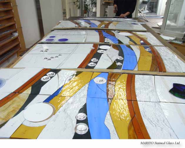 小林 一夫 2008年4月30日 | お疲れ様で〜す いっしょの職場の同僚みたいですね(笑) この後は H型の鉛で組んでいきます 5枚横並び構成の窓が上下に 計10パネルのステンドグラスの制作です 一枚一枚の図柄に独立性を持たせていますが 全てに繋がりがあって 全部が繋がったとき・・・。 何かを感じられたらいいなって思います 私の仕事は、バラバラなった硝子を繋ぐ仕事です。