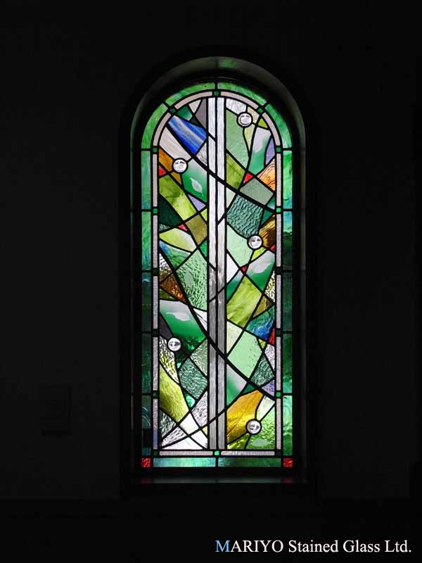マンションの玄関脇のアーチ窓にステンドグラスを取り付けました
