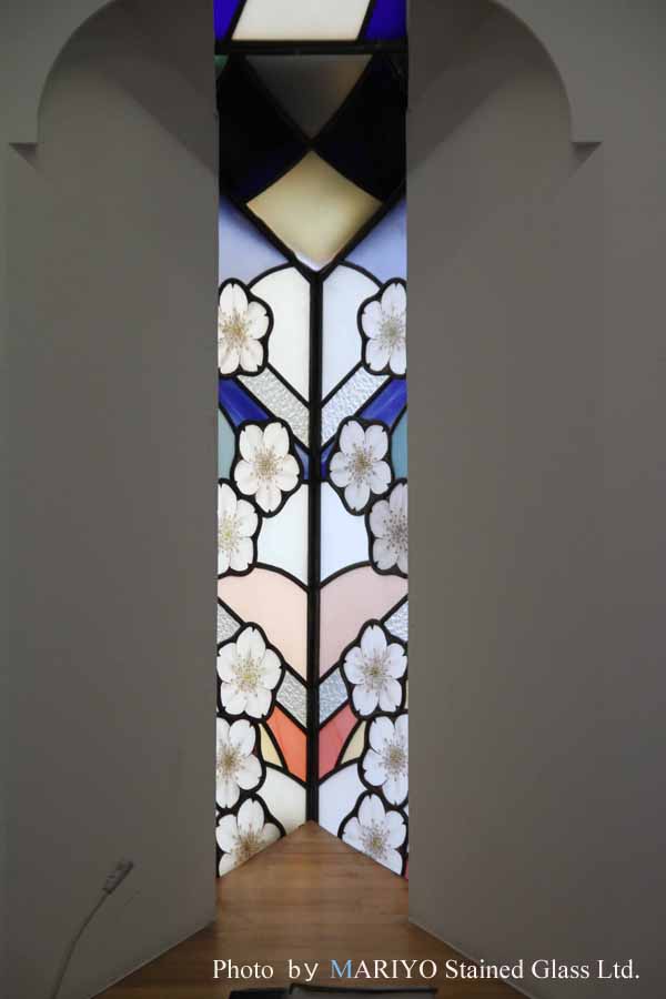 ステンドグラスは、美しい桜のデザインの絵付けが施されていました。