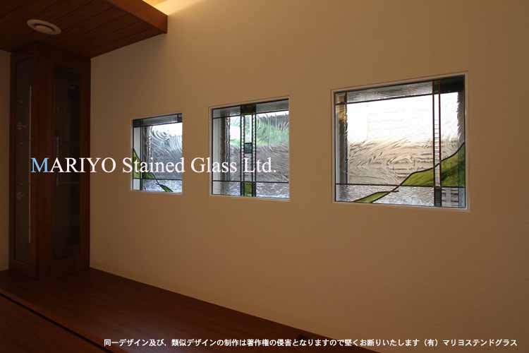 四角い窓に 3連デザインのシンプルなステンドグラスを設置
