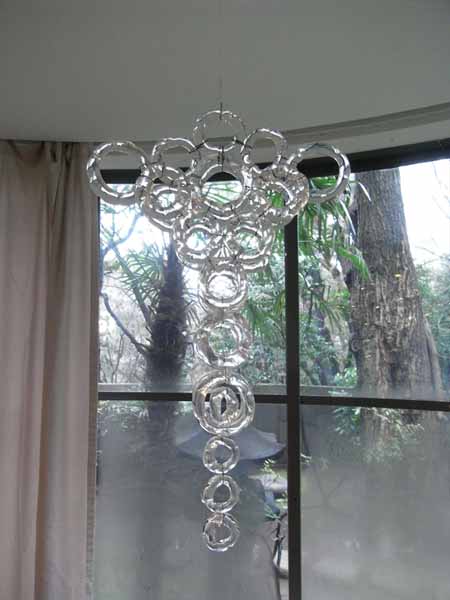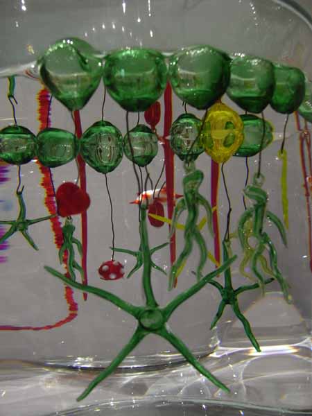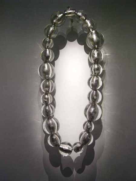 ムラーノガラスを素材とした色とりどりのガラス玉を連ねた立体作品を中心に