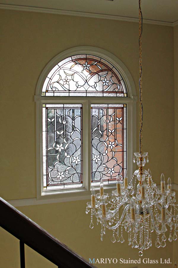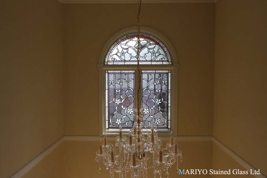 輸入住宅 玄関上部の吹き抜窓に設置した、白い花のステンドグラスです。