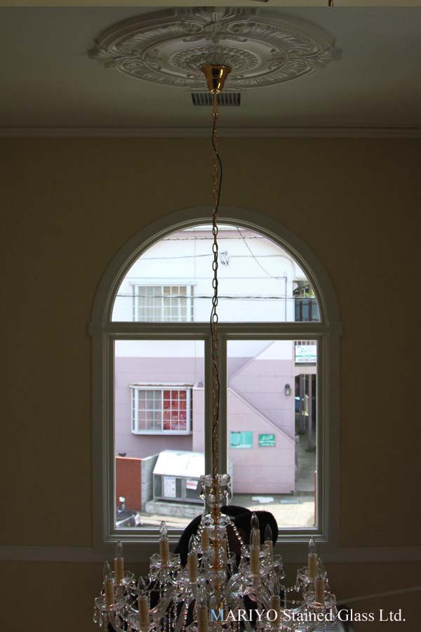 ステンドグラス設置後は、豪華なシャンデリアとステンドグラスが一体となり