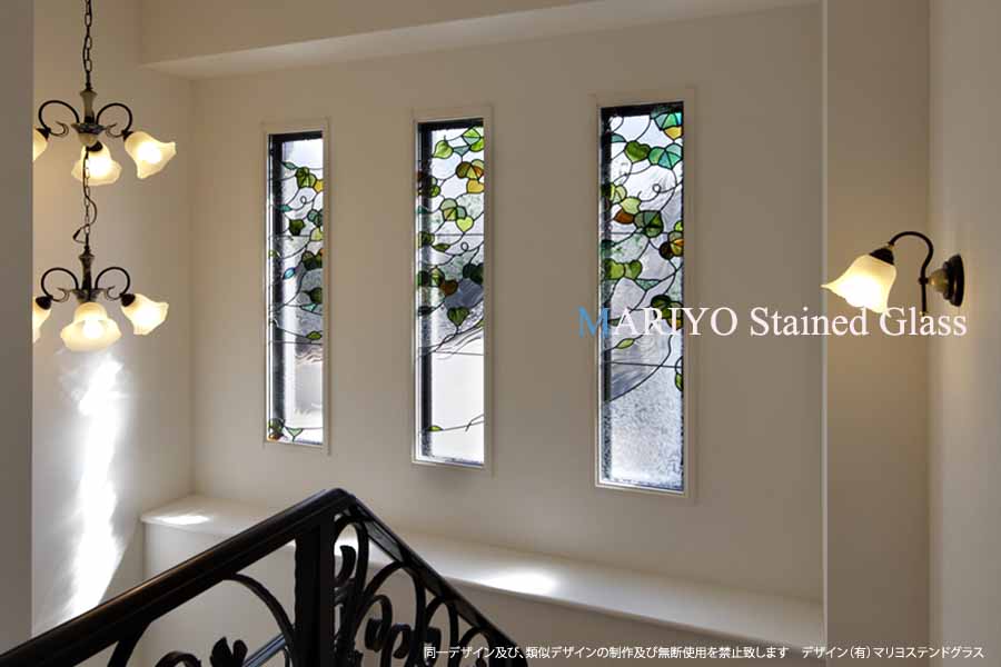 神戸の住宅に設置した、緑が美しい蔦の葉のステンドグラスを