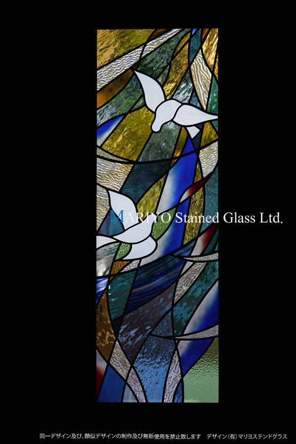 背景の青いガラスの一部は、2層の高級被せアンティークガラスを