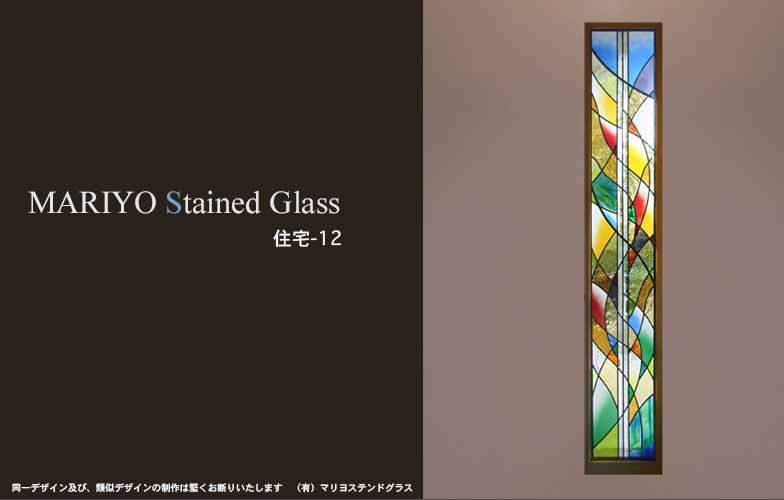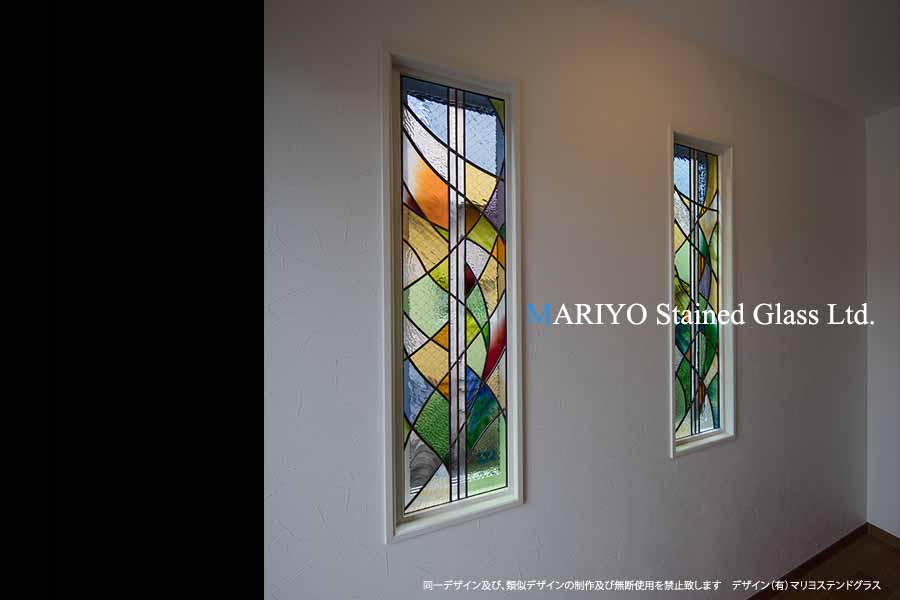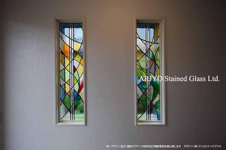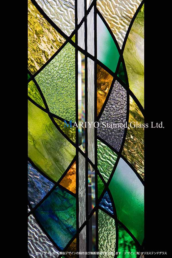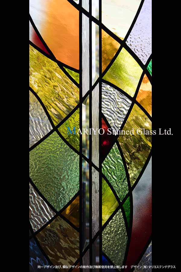 中央の縦長のガラスは、大空から降り注ぐ光をイメージし、カラフルで絶妙な配色のステンドグラスパネルです。