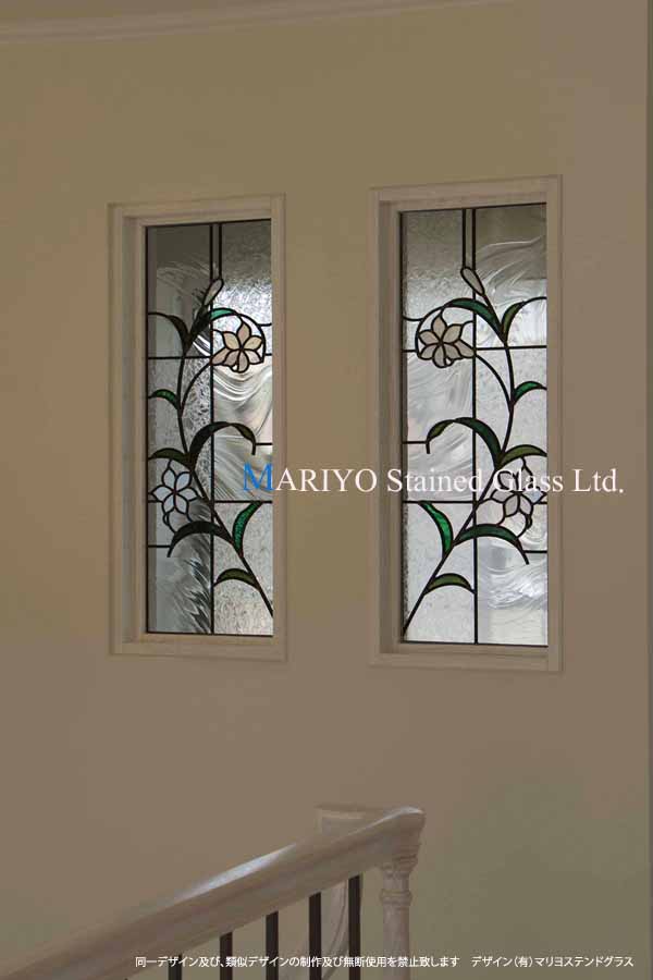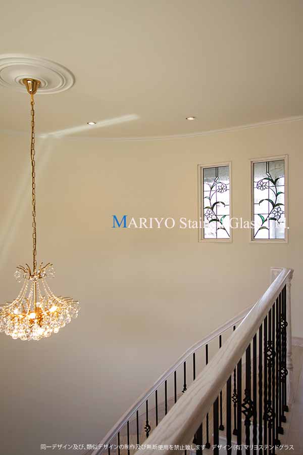 サーキュラー階段(螺旋)壁面と2階廊下の間仕切りの壁に、ゆりの花図案のステンドグラスを埋め込みました。